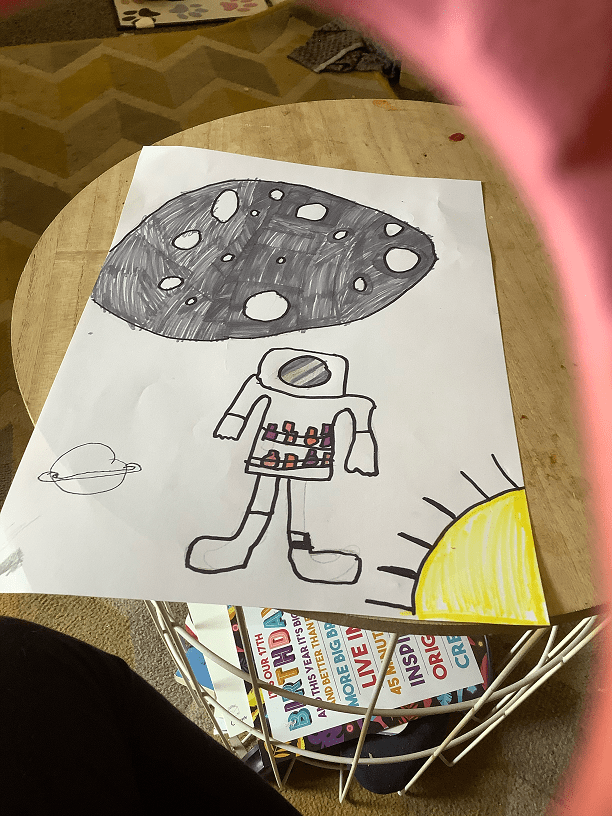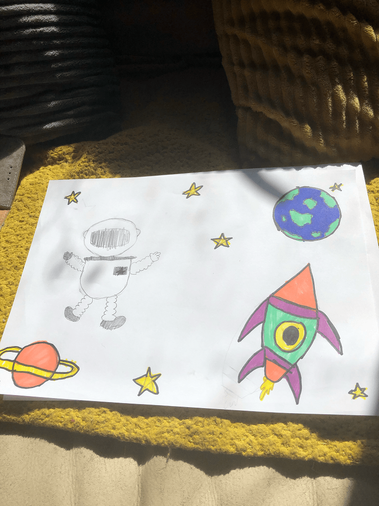 Today we were looking at how to draw an astronaut. What fantastic art P4/5 pupils have produced! Rio chose to use his Chromebook for this task and he also coloured in a picture for his granny. A kind, lovely gesture and full of meaning! Can you guess what picture it is? Kaci kept her fantastic drawing realistic, with a black and white astronaut, and colour on other elements. Khalea’s lovely drawing incorporated three different types of celestial bodies: a planet, a star (the sun) and an asteroid (made of rock). Very educational!